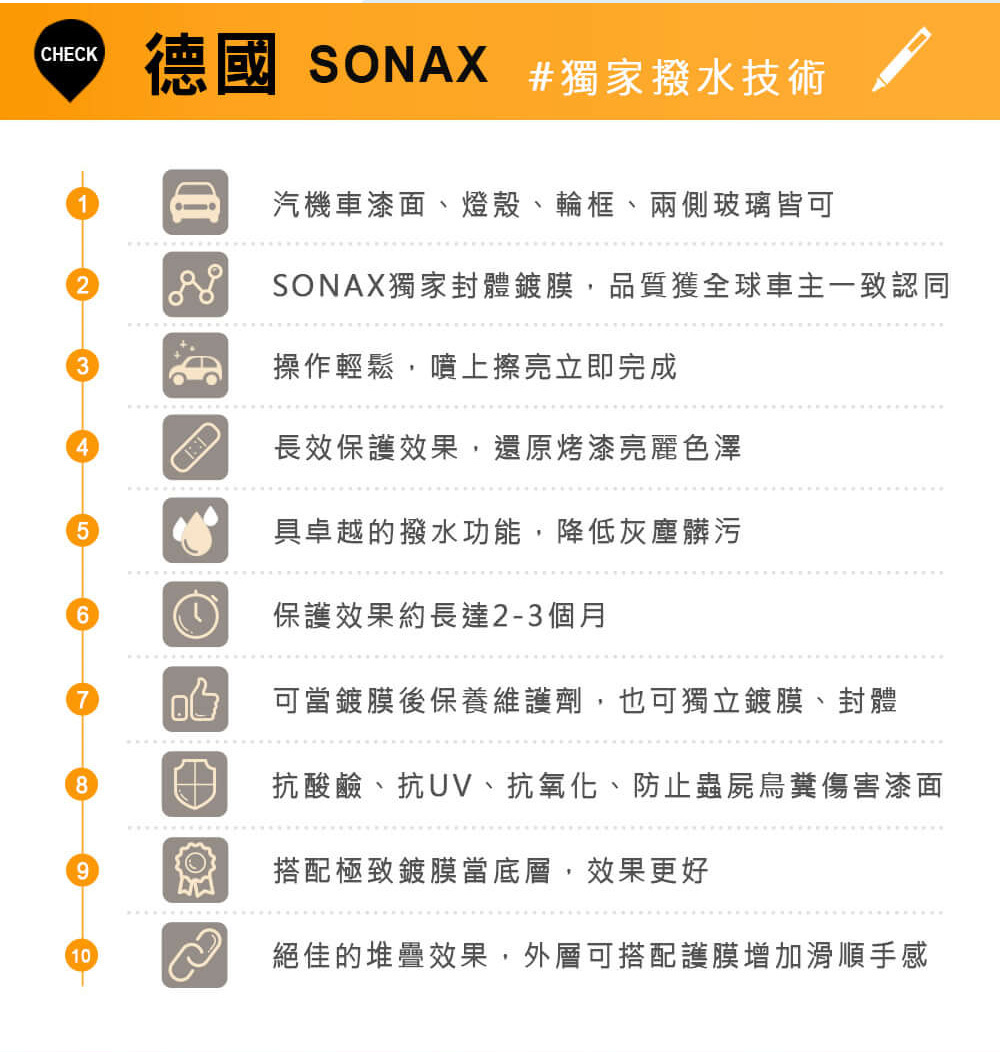 - SONAX超撥水鍍膜是非常適合做快速烤漆保養的鍍膜產品,可溫和清潔稍微髒汙的烤漆,並有優異的強潑水效果。