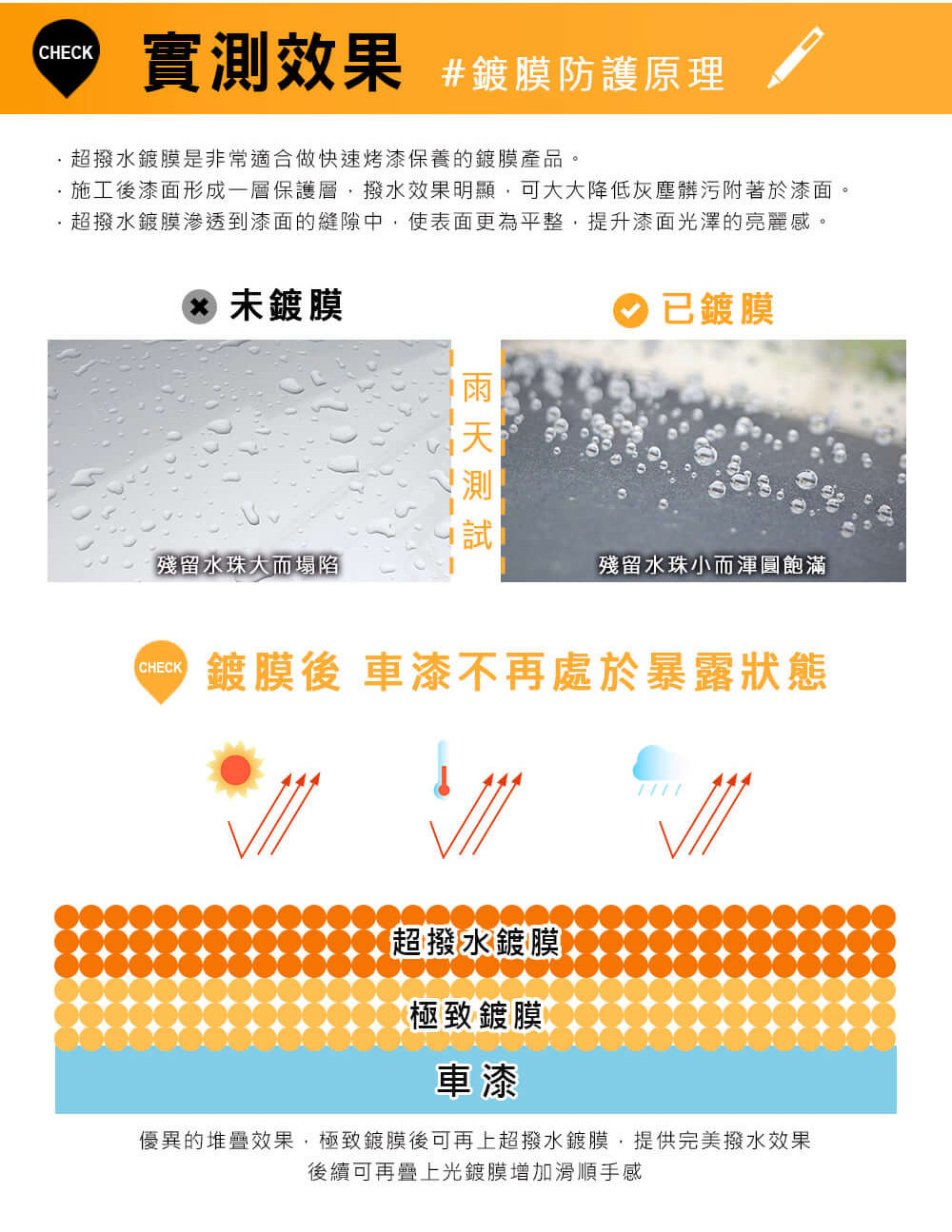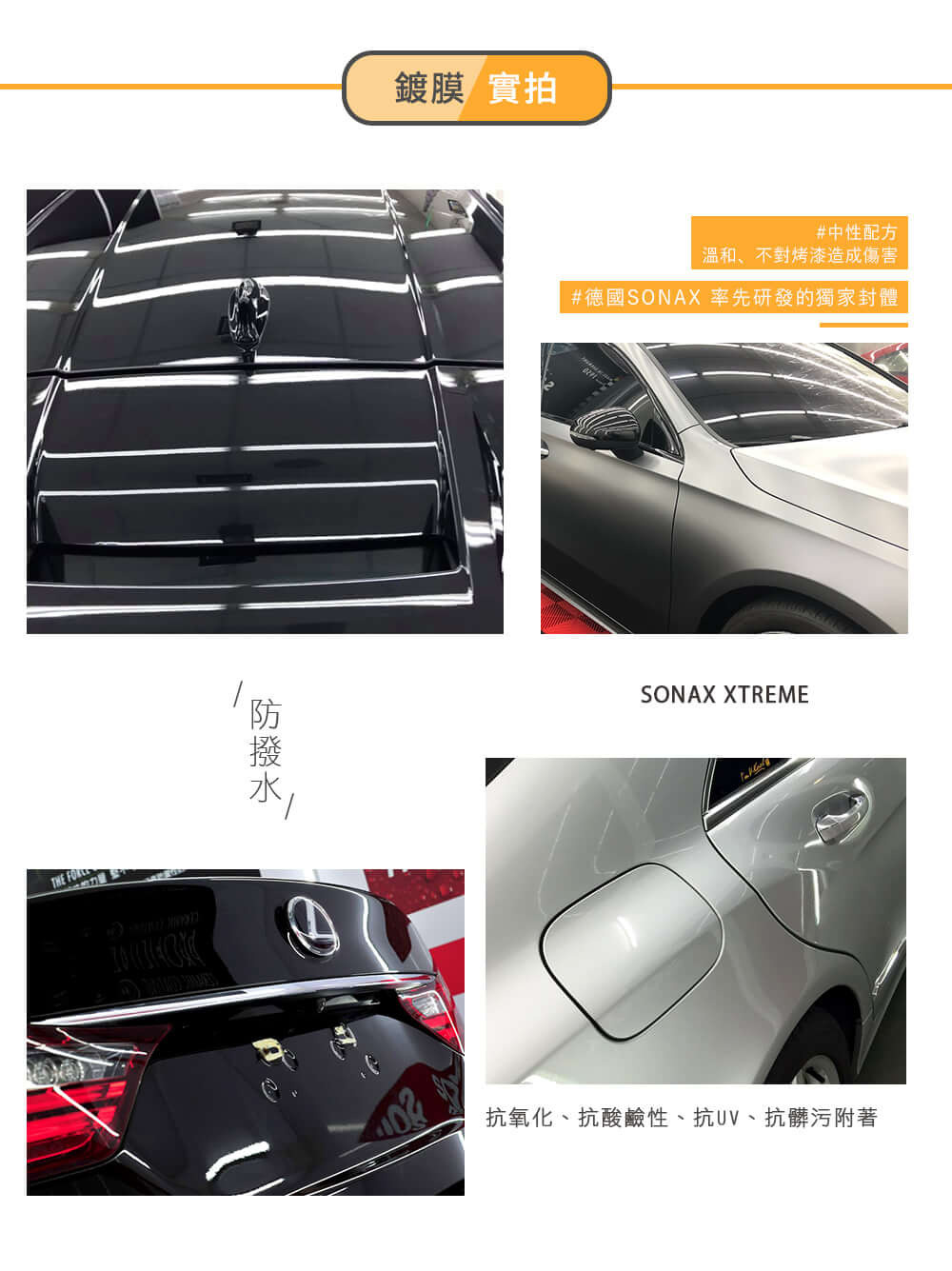 強潑水 / 抗UV / 耐酸鹼 / 奈米聚合物 / 超QD封體 / 鍍膜維護