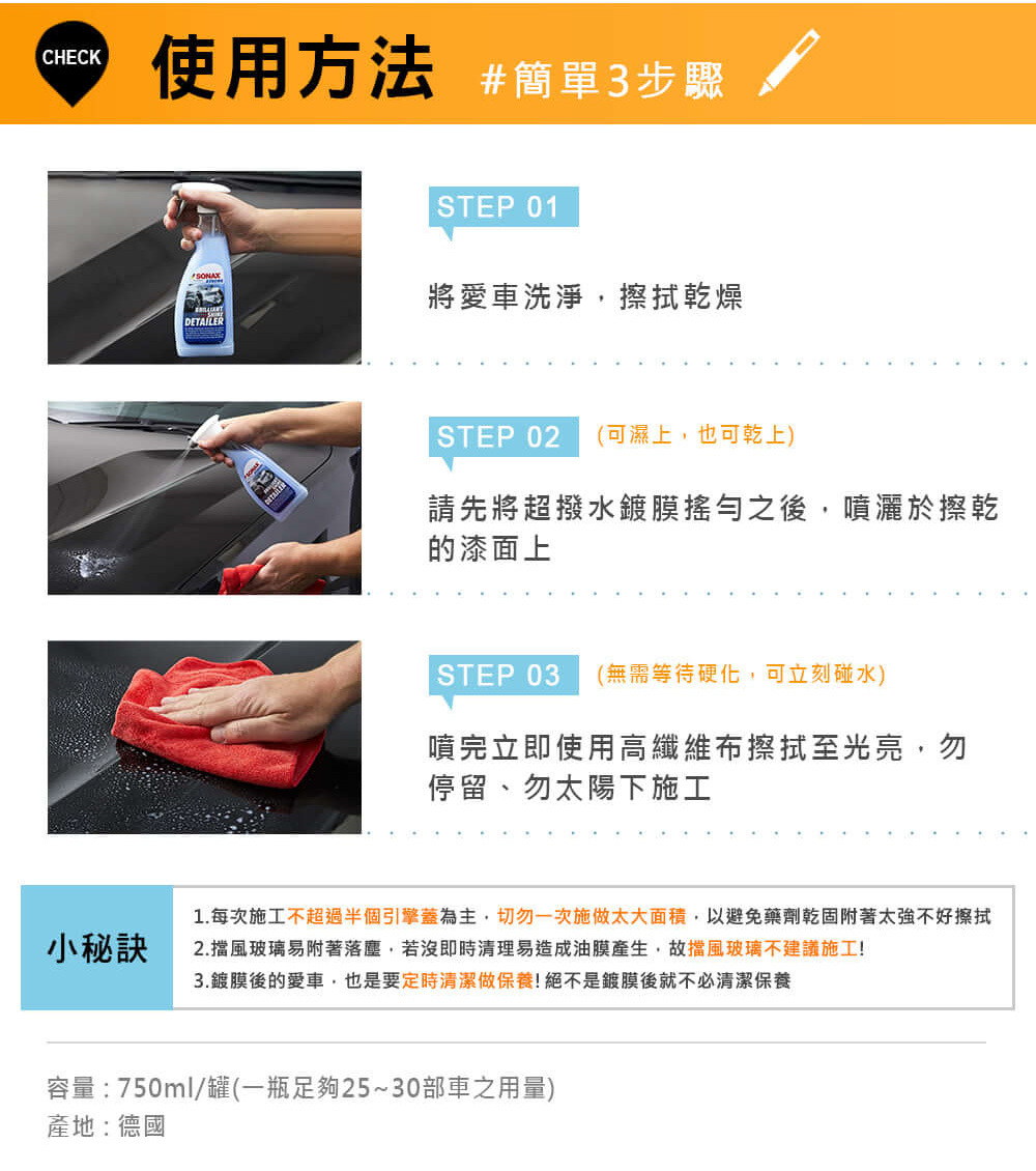- 立即使用SONAX鍍膜美容巾擦開並擦亮至無痕即可。