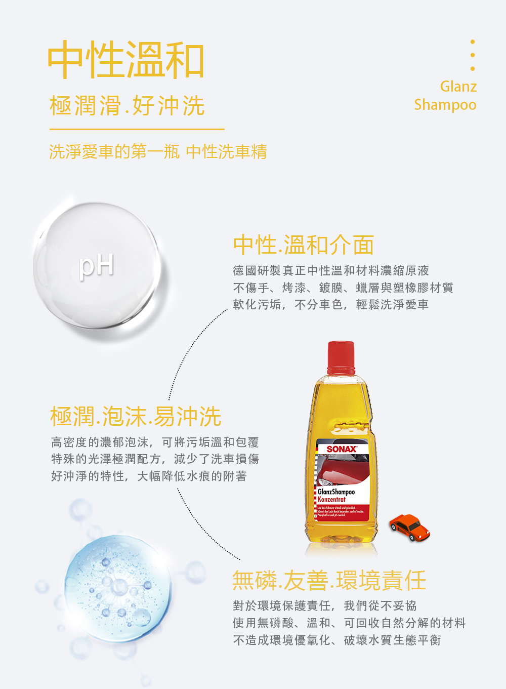 SONAX中性洗車精以高成本研發,通過歐盟嚴格標準檢驗與TÜV認證的中性.無磷產品,最純粹的濃縮比例,有效清潔特性、極潤滑介面大幅降低細紋產生,